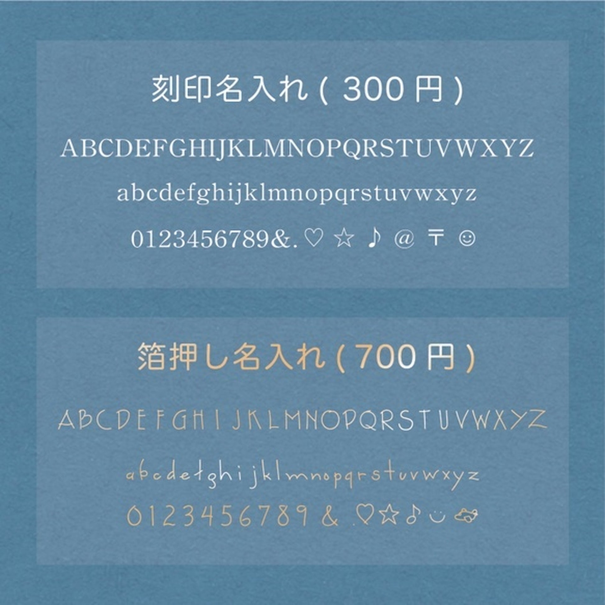 通常刻印と箔押しの2種類から選択可能。すべてハンドメイドで刻印しています。